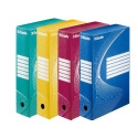 Archivačné krabice vo farebnom vyhotovení slúžia na ukladanie dokumentov do formátu A4. Rozmery: 35,5x25x80 mm.