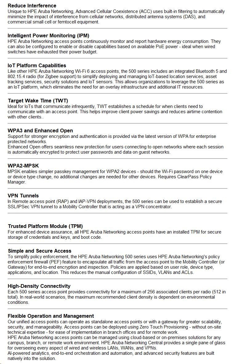 The HPE Aruba 500 Series delivers affordable, high-performance Wi-Fi 6 for schools, midsize offices, and retailers. With up to 1.49 Gbps real-world speed, it supports mobile, IoT, and demanding user needs.