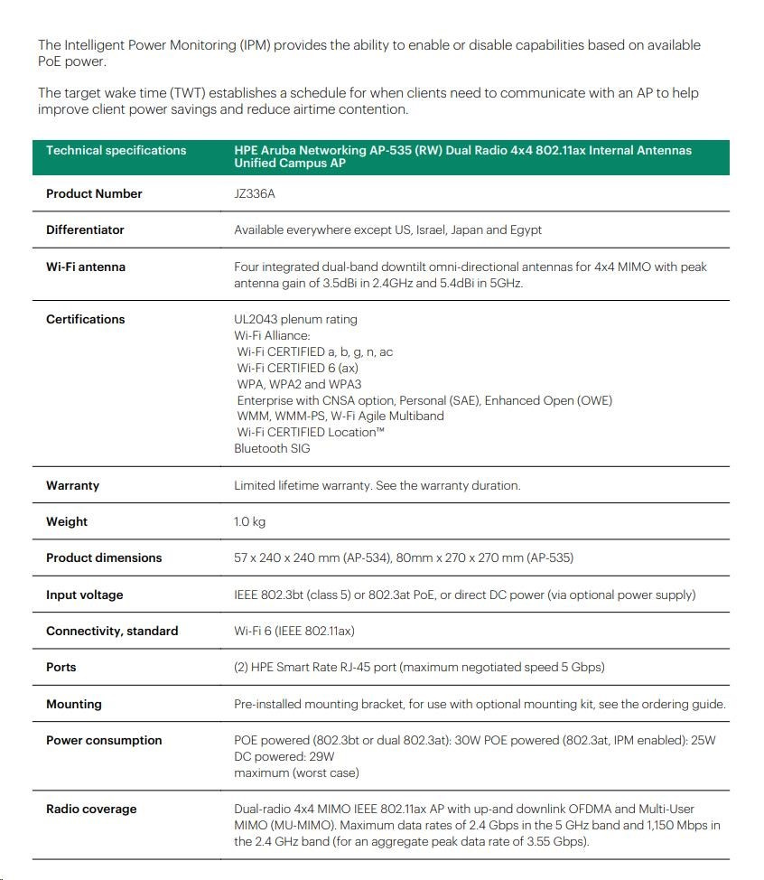 Popis Aruba AP-535 (RW) Dual Radio 4x4:4 802.11ax Internal Antennas Unified Campus AP RENEW JZ336A