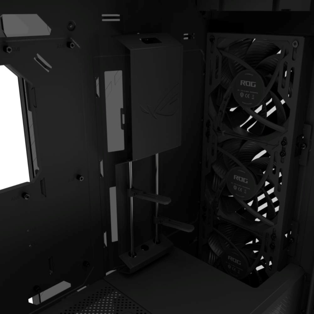 Herná skrinka ROG Strix Helios II EATX typu mid-tower s dvojitými bočnými panelmi z tvrzeného skla, podporou grafickej karty dlhšej až 450 mm, hliníkovým rámom a predným panelom, výstuhami pre grafickú kartu a podporou 420mm radiátora