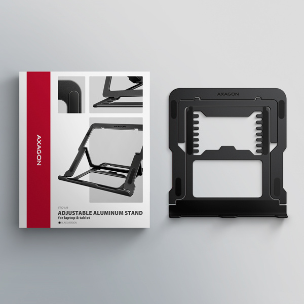 AXAGON STND-LAB je stojan na notebook či tablet, který zajišťuje pohodlí a zlepšuje ergonomii při práci. Je ideální pro zařízení s úhlopříčkou od 10" do 17.3" a umožňuje nastavení až osmi poloh. Snadno tak najdete ideální sklon stojanu pro maximální uvolnění vašich krčních a zádových svalů. Užijte si komfortní pracovní prostředí s kompaktním a přenosným stojanem, který se dokonale přizpůsobí vašim potřebám, ať už pracujete doma, v kanceláři, nebo na cestách.