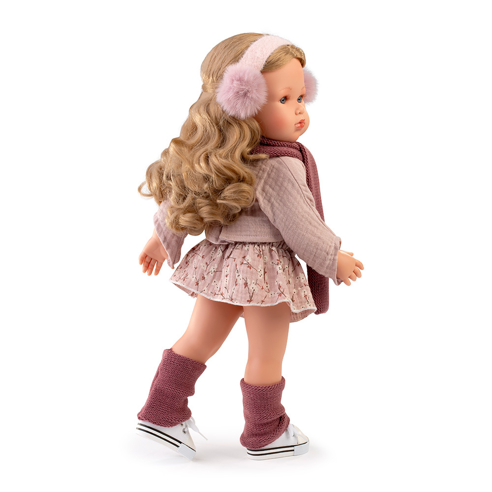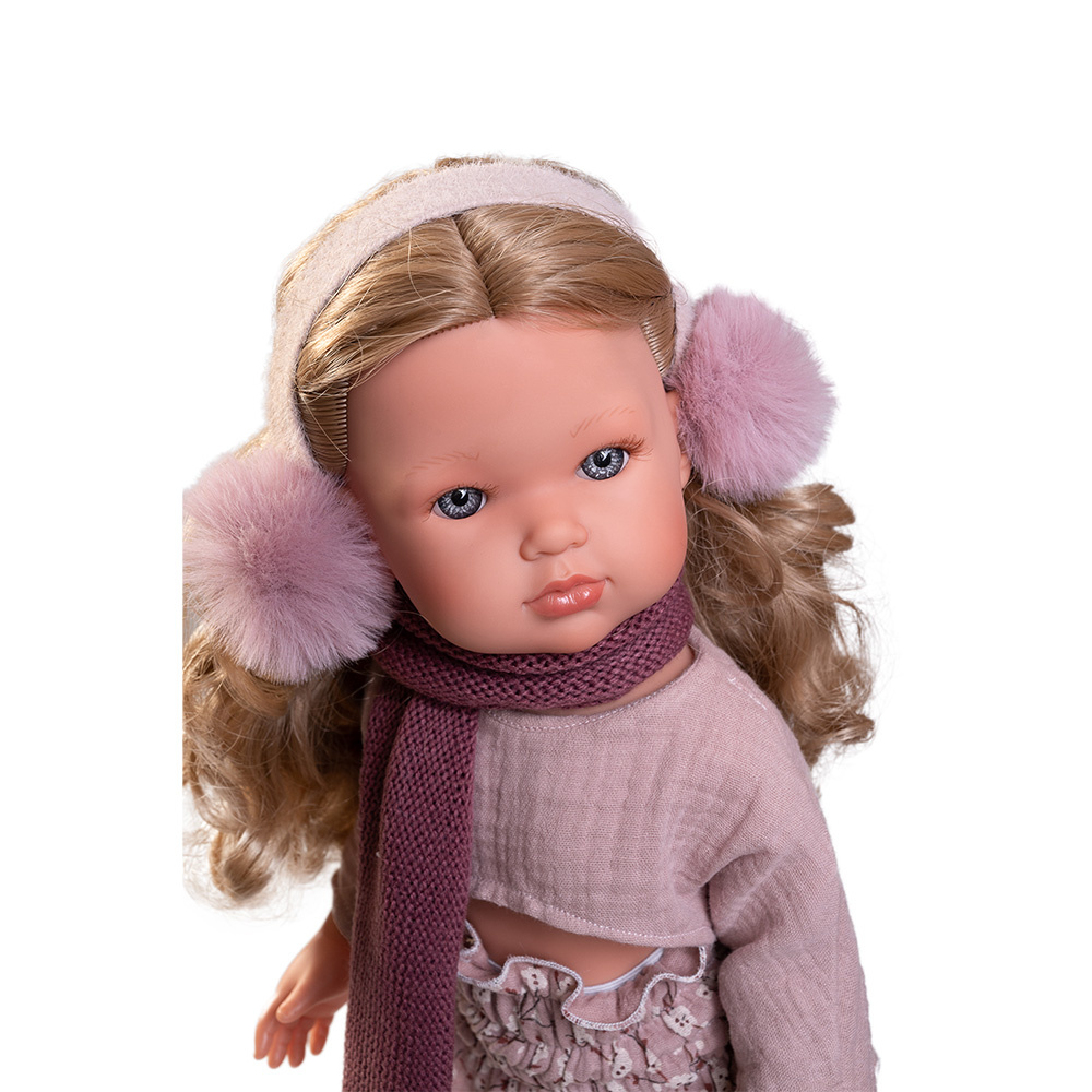 Pretože je vonku chladno, nosí brmbolcové náušníky so šálom a návleky na nohy.