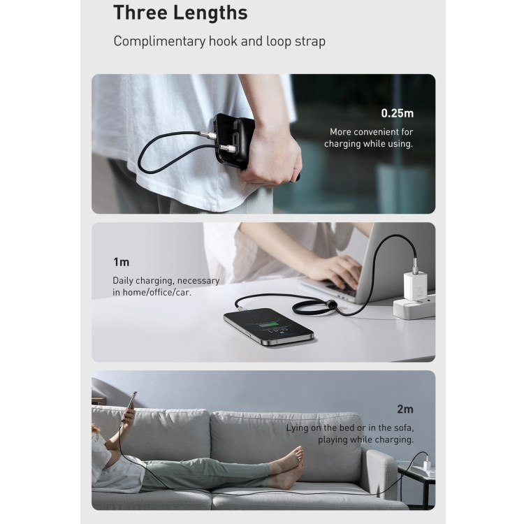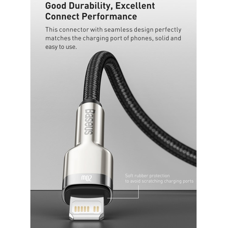 Kábel BASEUS Cafule Metal Series je odolný kábel, ktorého koncovky sú potiahnuté zliatinou zinku, aby vydržali dlhé a náročné používanie. Výrobok je tiež vybavený špeciálnym nylonovým opletením, ktoré zabraňuje treniu a chráni káble vo vnútri. Zlepšila sa aj odolnosť konektorov - boli testované na 10 000 spojení a boli špeciálne profilované tak, aby sa kábel dal používať aj vtedy, keď je telefón v puzdre. Kábel má funkciu rýchleho nabíjania a prenosu dát PD 20 W. Jeho dĺžka je 200 cm.