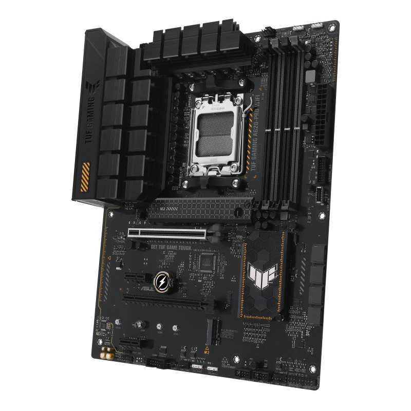 ASUS TUF GAMING A620-PRO WIFI takes all the essential elements of AMD Ryzen 7000-series processors and combines them with game-ready features and proven durability. Engineered with military-grade components, an upgraded power solution and a comprehensive cooling system, this motherboard goes beyond expectations with rock-solid and stable performance for marathon gaming. TUF GAMING motherboards also undergo rigorous endurance testing to ensure that they can handle conditions where others may fail. Aesthetically, this model incorporates rugged off-black and geometric design elements to reflect the dependability and stability that defines the TUF GAMING series.