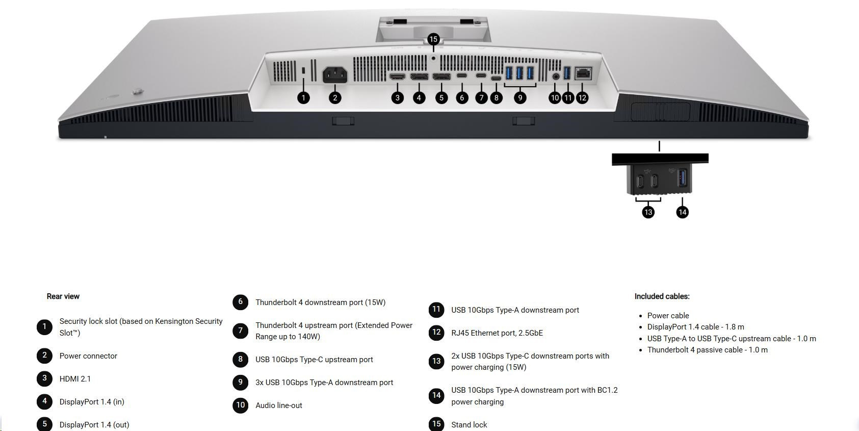 - 1 Thunderbolt 4 upstream port (DP1.4 (HDCP 2.2) s podporou DSC, PD: Až 140W EPR, prepínanie 2/4 Laní)