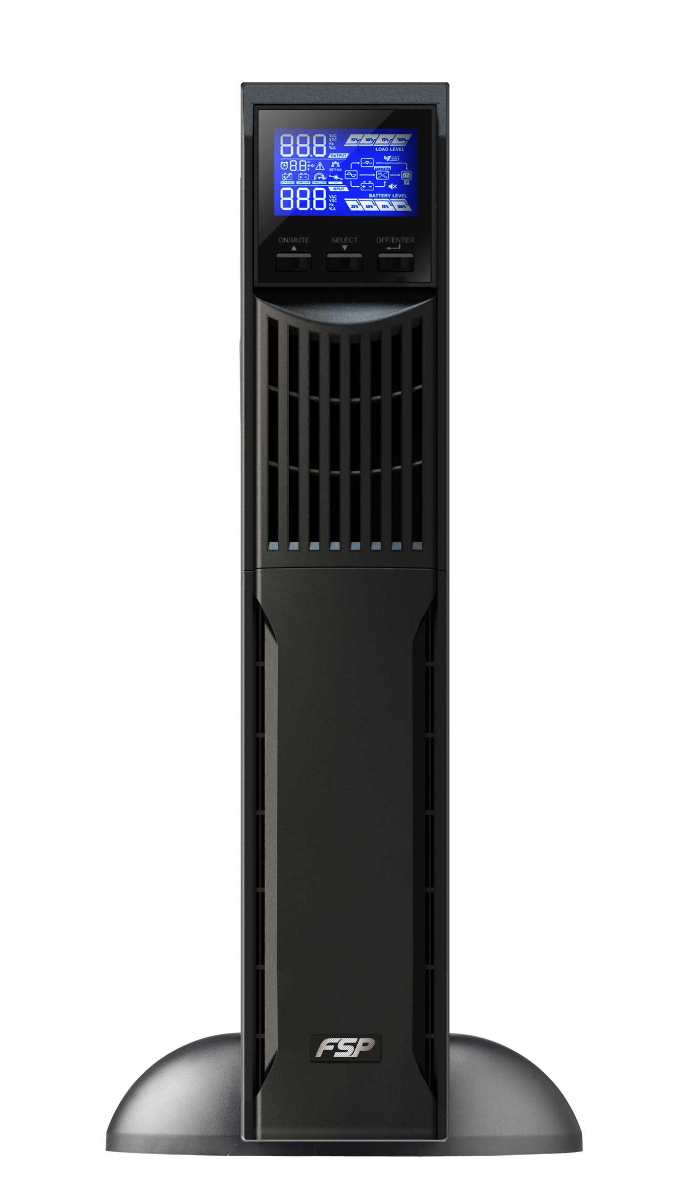 - Komplexný displej umožňuje jednoduché monitorovanie stavu a prístup k UPS