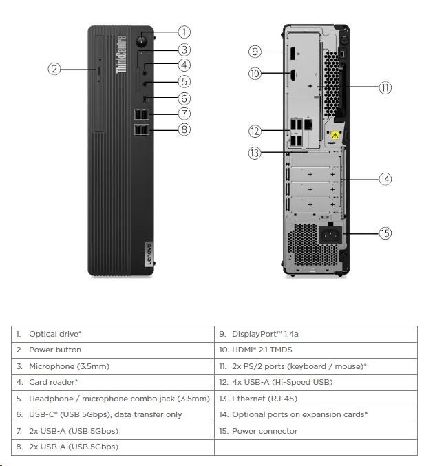 Predné porty | 1x USB-C® (USB 5Gbps / USB 3.2 Gen 1), with 15W charging 4x USB-A (USB 5Gbps / USB 3.2 Gen 1) 1x headphone / microphone combo jack (3.5mm) 1x microphone (3.5mm) |