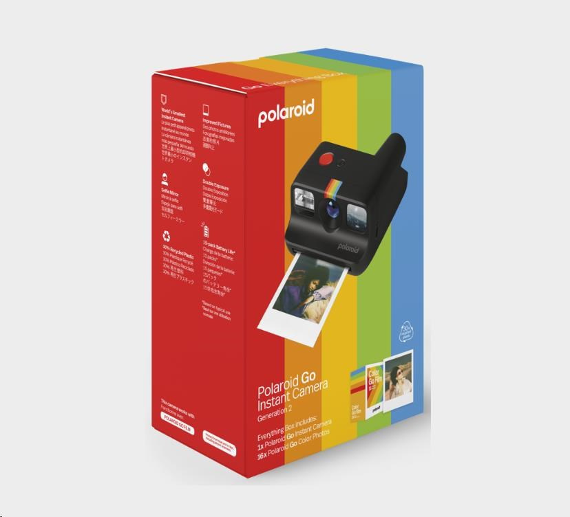 Je opravdu malý (nejmenší fotoaparát na světě), ale má velký tvůrčí potenciál, zrcátko pro selfie, samospoušť, dvojitou expozici a lze jej spárovat s vlastními malinkými barevnými filtry. To vše v klasickém designu a nyní vyrobeném z 30 % z recyklovaných materiálů. Součástí balení je dvojbalení filmů Polaroid Color Go pro 16 barevných instantních fotografií s bílými rámečky.