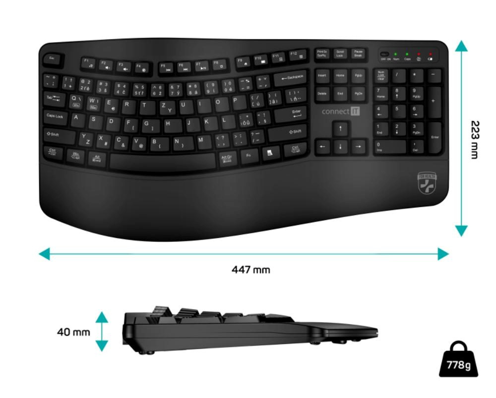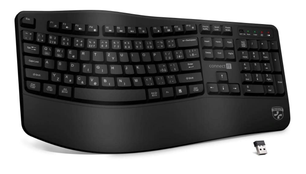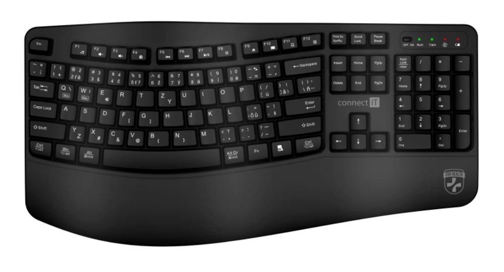 Popis CONNECT IT FOR HEALTH Ergonomická klávesnice ErgoOffice, Bezdrátová, CZ+SK, černá