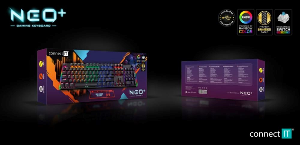 Profesionální mechanická klávesnice NEO2 + series pro hráče počítačových her v českém a slovenském layoutu s devíti módy barevného Rainbow podsvícení. K dispozici je 12 multimediálních kláves a otočné kolečko pro nastavení hlasitosti a dalších funkcí.