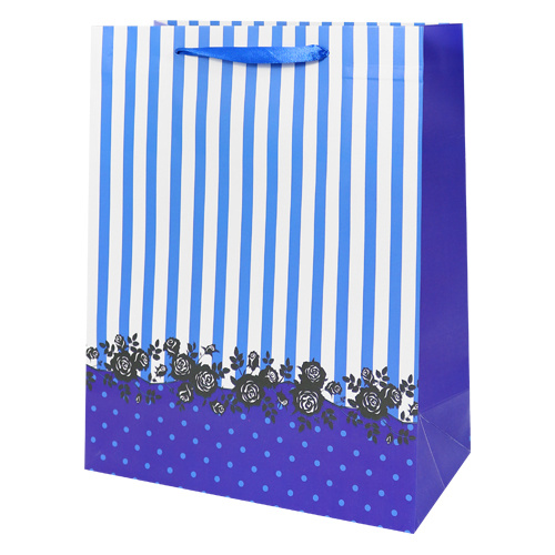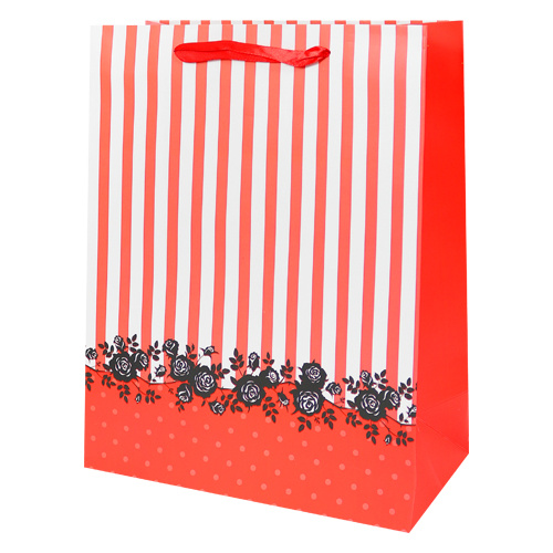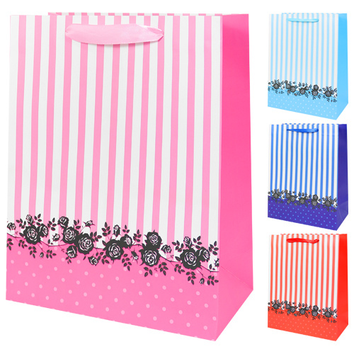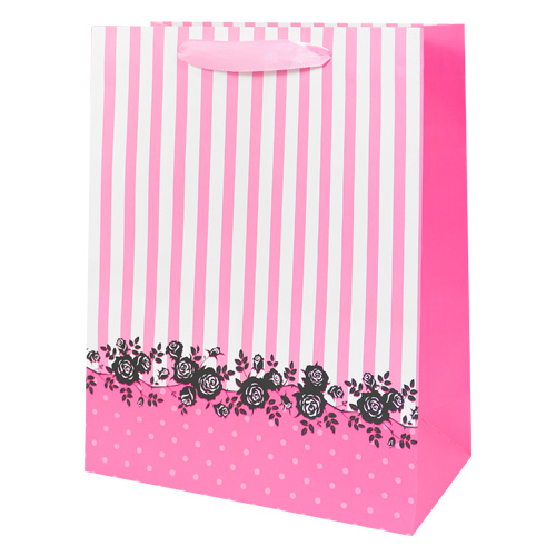 Taška z pevného papiera s pásikovým vzorom a ružičkami vhodná na rôzne príležitosti.