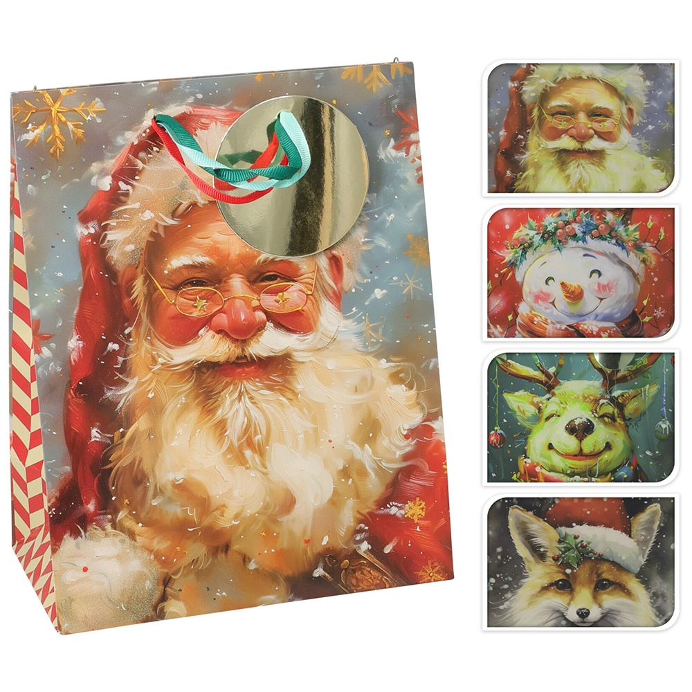 Vianočná darčeková taška s trblietavým vzorom na prednej strane v 4 motívoch strednej veľkosti.