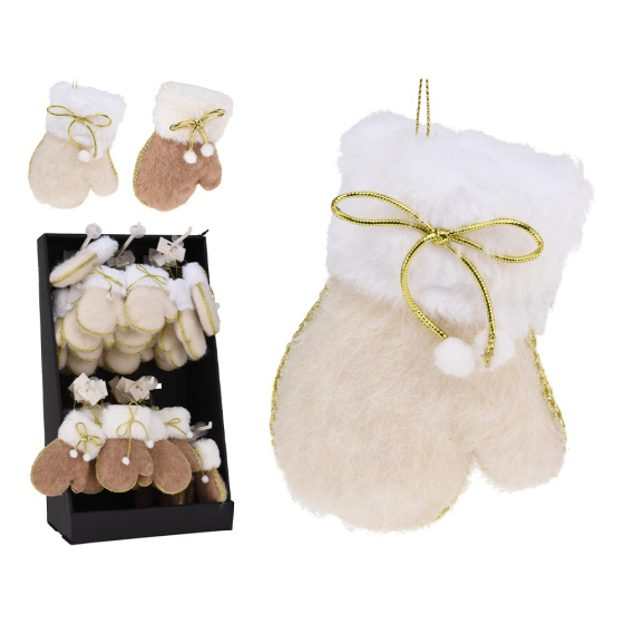 Rukavica zdobená lemovaním a šnúrkou zlatej farby ako vianočná dekorácia na zavesenie.