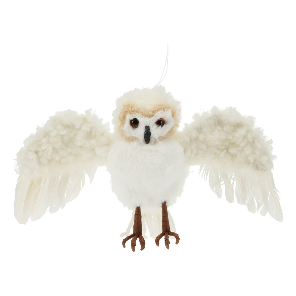 Biela sovička s roztiahnutými krídlami ako dekorácia na zavesenie.