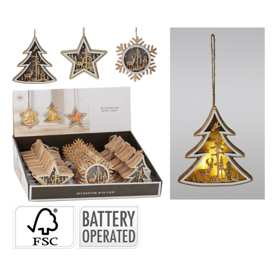 Dekorácia závesná - vianočné motívy s LED osv. na drevenom podklade, 12 cm, mix /1ks