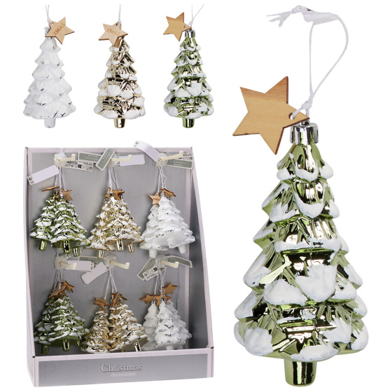 Zasnežený vianočný stromček ako závesná ozdoba.