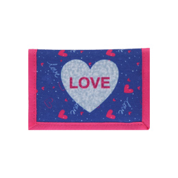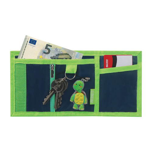 Detská peňaženka so zapínaním na suchý zips. Vnútro obsahuje: PVC okienko, krúžok na kľúče, 1 vnútornú priehradku na zips a zasúvaciu priehradku, 1 vonkajšie PVC okienko so zapínaním na zips. Rozmery: 12,5 x 8,5 cm (zložené) a háčik na pútko. Materiál: 100 % polyester.