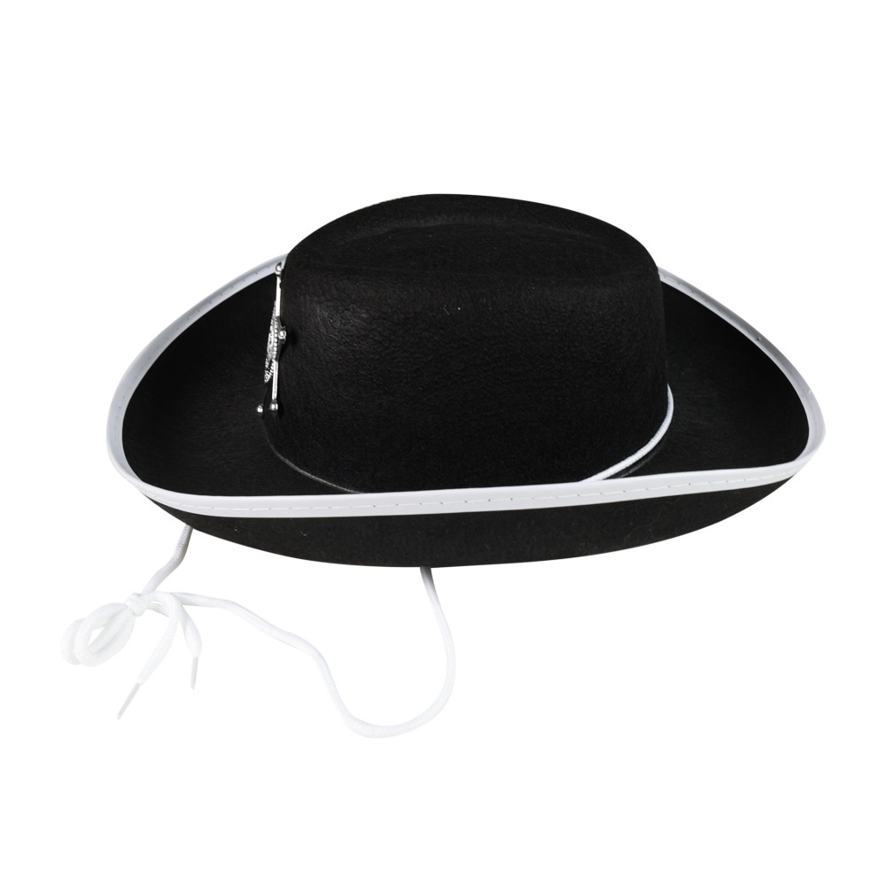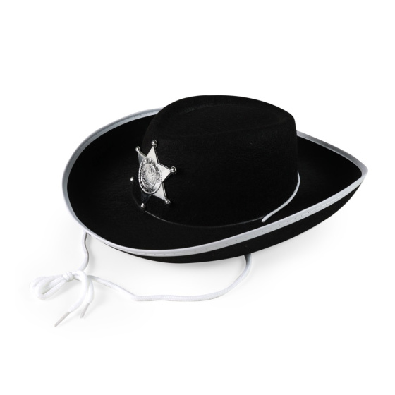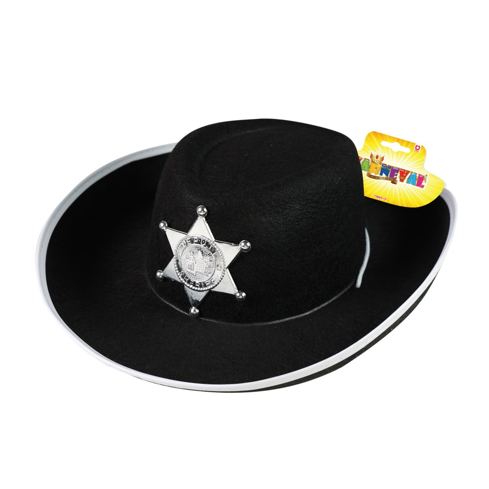 Senzačný klobúk pre šerifov! Tento čierny elegán je zdobený opravdickým odznakom s nápisom SHERIFF a strieborným lemovaním. Staň sa hviezdou karnevalového večierku vďaka tomuto klobúku!