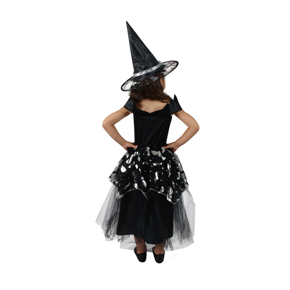 Parádny čarodejnícky kostým s netopierími motívmi! Kostým o veľkosti S je určený pre dievčatká vo vekovom rozmedzí 3-6 rokov (105-116 cm). Čierne šaty s nadýchanou sukňou sú zdobené striebornými prvkami a strieborným lemovaním. Súčasťou balenia je aj perfektne zladený klobúk, ktorý je takisto zdobený striebornou stuhou. Staň sa hviezdou karnevalového večierka vďaka tomuto kostýmu! Vhodný aj na oslavu Halloweenu.