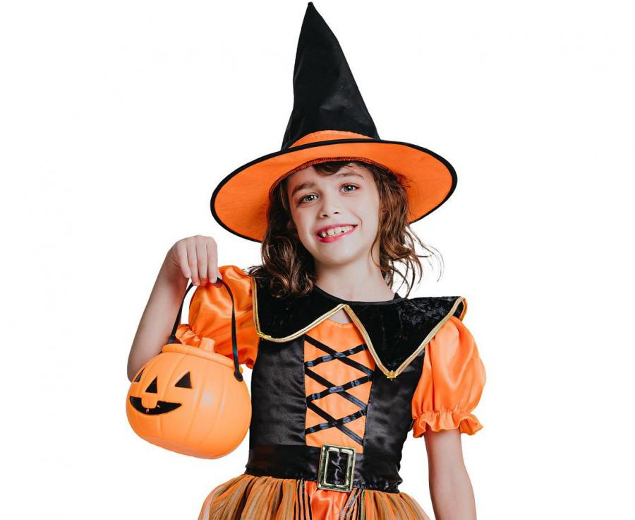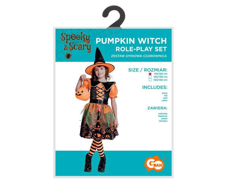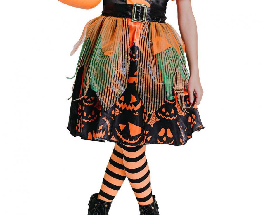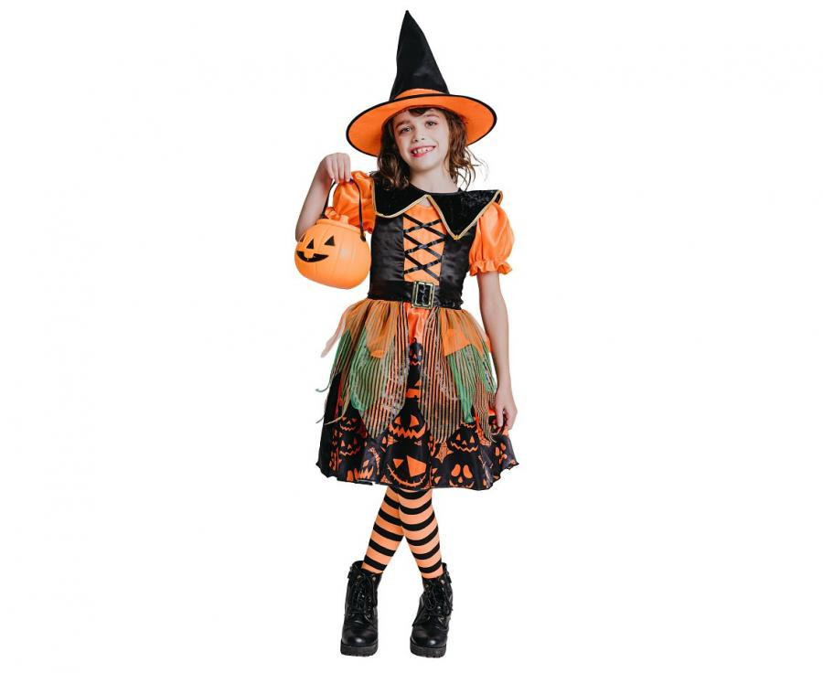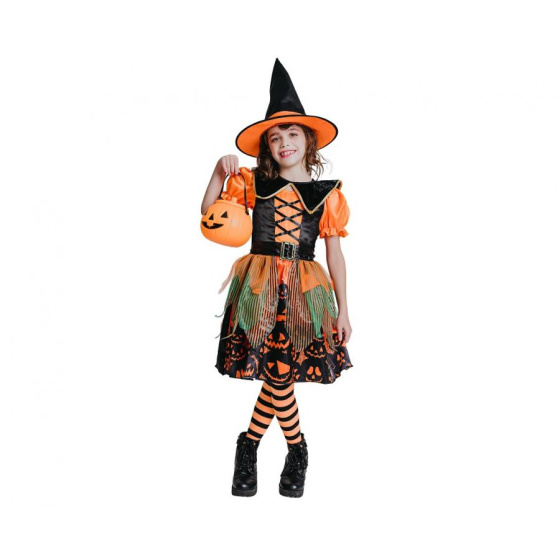 Detský kostým Čarodejnica s motívom tekvice, veľkosť 110/120 cm
