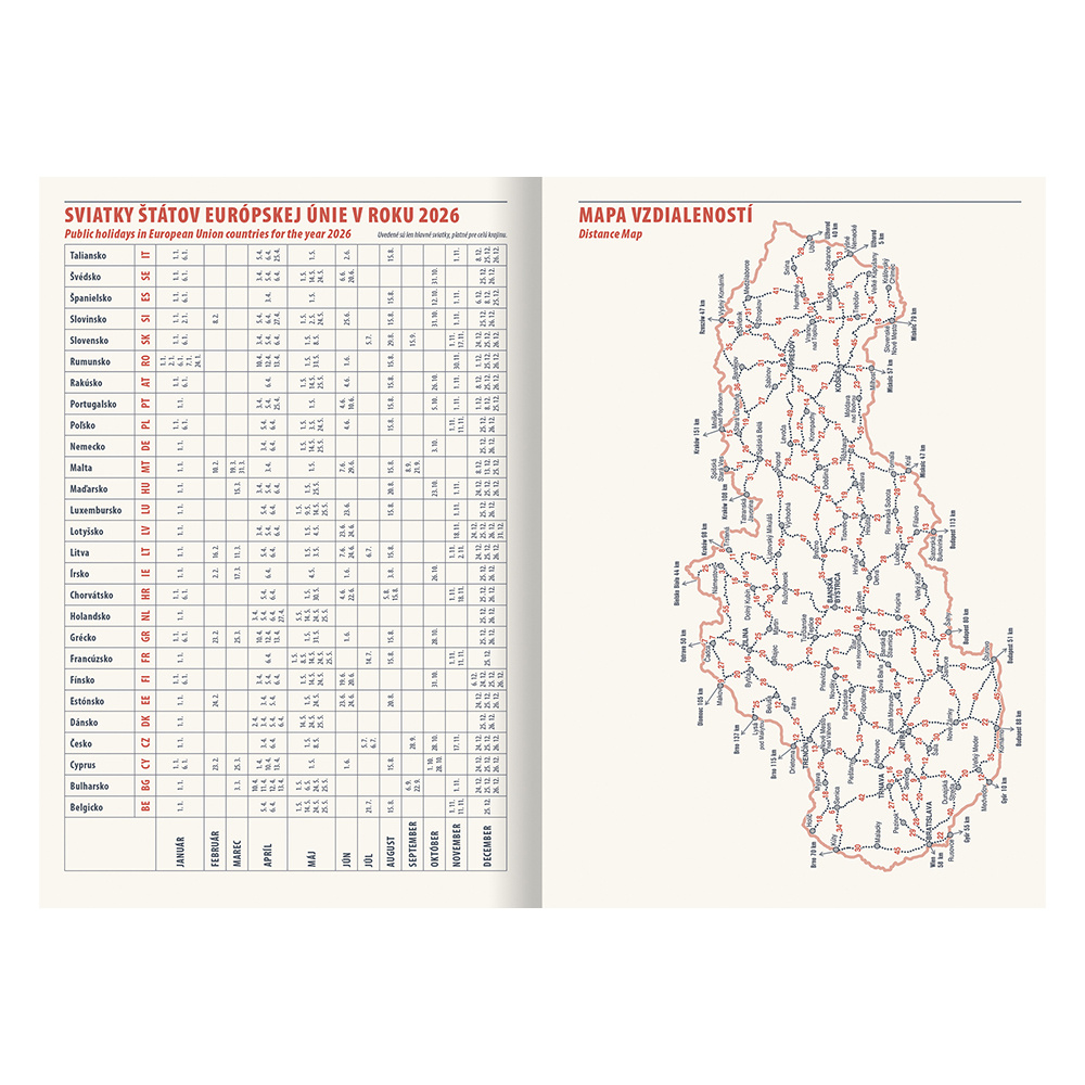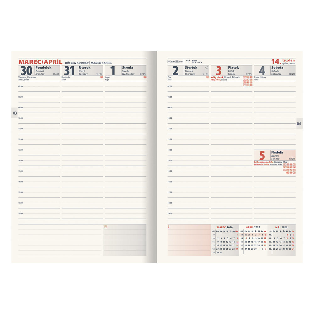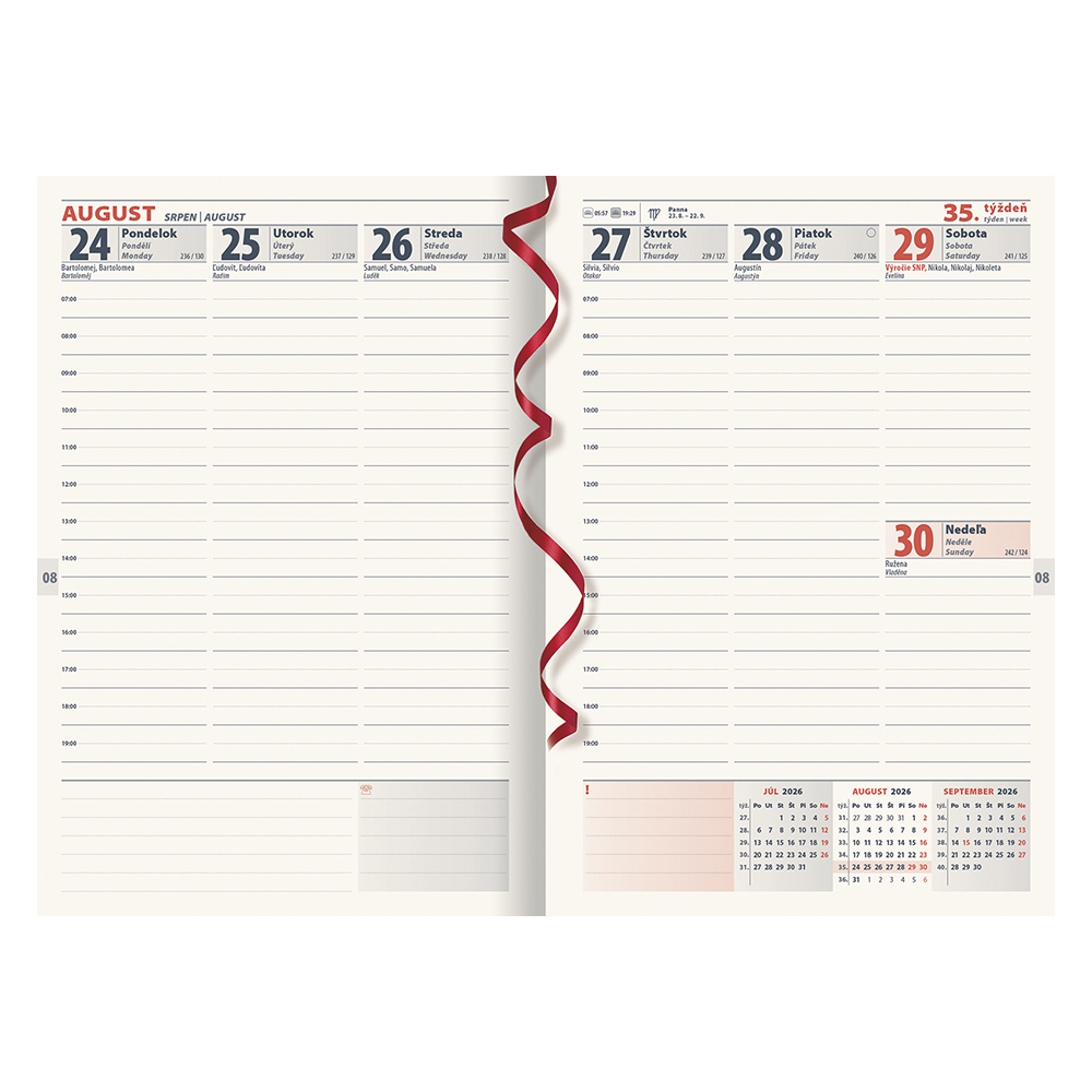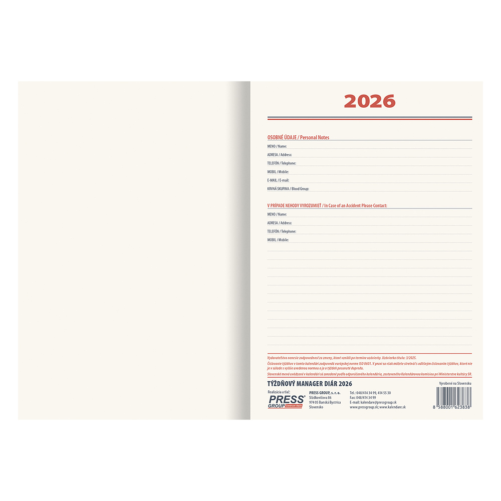 Formát: 165 x 245 mm (B5). Matná obálka s razbou roku. Krémové listy. Tvrdá šitá väzba V8, 128 strán. Cena za 1 ks výrobku. Týždenný manager diár s béžovou matnou obálkou s hodinovým delením. Obsahuje slovenské a české kalendárium, anglický preklad mesiacov a dní, informácie o štátnych sviatkoch susediacich krajín EÚ, prehľadný a plánovací kalendár, školské prázdniny, prehľad dôležitých inštitúcií, adresár. Ponúka dostatočný priestor pre písanie poznámok a pripomienok.