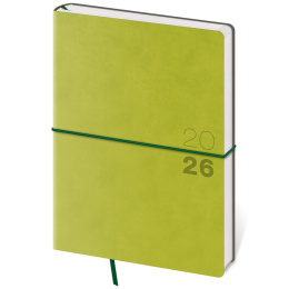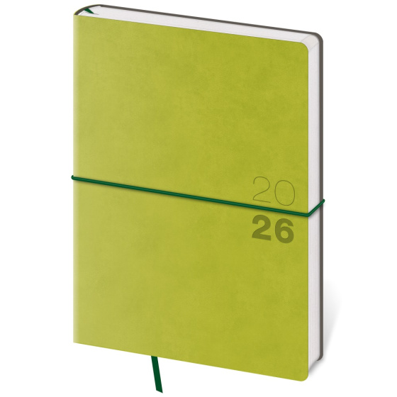 Moderný diár v mäkkej ohybnej väzbe s guľatou priečnou gumičkou cez chrbát predstavuje najnovší spôsob spracovania. Diár je príjemný do ruky vďaka matnej koženke a ľahký vďaka mäkkým doskám. Materiál dosiek sa hodí na sleporazbu, ktorá na koženke vynikne. Diár obsahuje: osobné údaje, plánovač dovolenky (mesačný prehľad), plánovací kalendár, telefónne predvoľby, štátne sviatky Českej a Slovenskej republiky, medzinárodné sviatky, ročný výhľad, týždenný layout, adresár, mapa Európy a Českej a Slovenskej republiky Formát diára: 145 x 205 mm Rozsah diára: 128 strán Kalendárium: týždenné