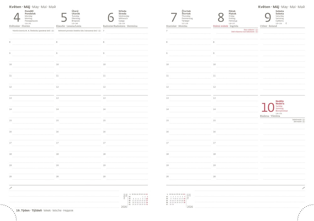 Matná koženka predstavuje kvalitný, na dotyk príjemný a zároveň veľmi obľúbený materiál. Hrúbka materiálu umožňuje dosiahnuť perfektné výsledky pri sleporazbe bez fólie. Diár obsahuje: osobné údaje, plánovač dovolenky (mesačný prehľad), plánovací kalendár, telefónne predvoľby, štátne sviatky Českej a Slovenskej republiky, medzinárodné sviatky, ročný výhľad, týždenný layout, adresár, mapa Európy a Českej a Slovenskej republiky Formát diára: 170 x 240 mm Rozsah diára: 128 strán Kalendárium: týždenný