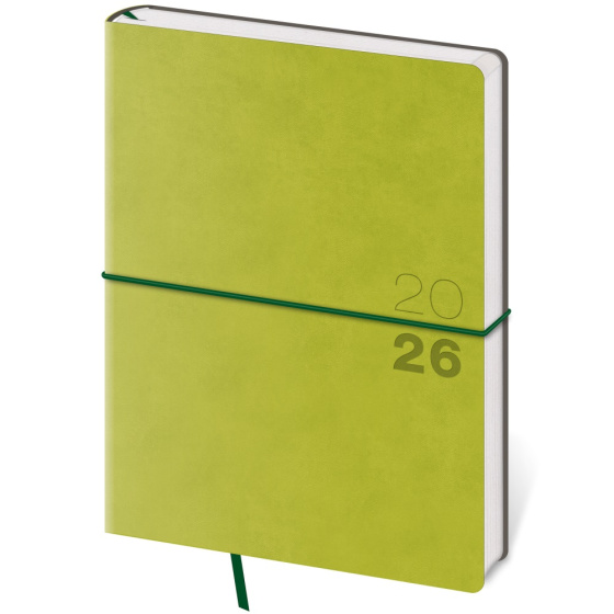 Moderný diár v mäkkej ohybnej väzbe s guľatou priečnou gumičkou cez chrbát predstavuje najnovší spôsob spracovania. Diár je príjemný do ruky vďaka matnej koženke a ľahký vďaka mäkkým doskám. Materiál dosiek sa hodí na sleporazbu, ktorá na koženke vynikne. Diár obsahuje: osobné údaje, plánovač dovolenky (mesačný prehľad), plánovací kalendár, telefónne predvoľby, štátne sviatky Českej a Slovenskej republiky, medzinárodné sviatky, ročný výhľad, týždenný layout, adresár, mapa Európy a Českej a Slovenskej republiky Formát diára: 120 x 165 mm Rozsah diára: 128 strán Kalendárium: týždenné