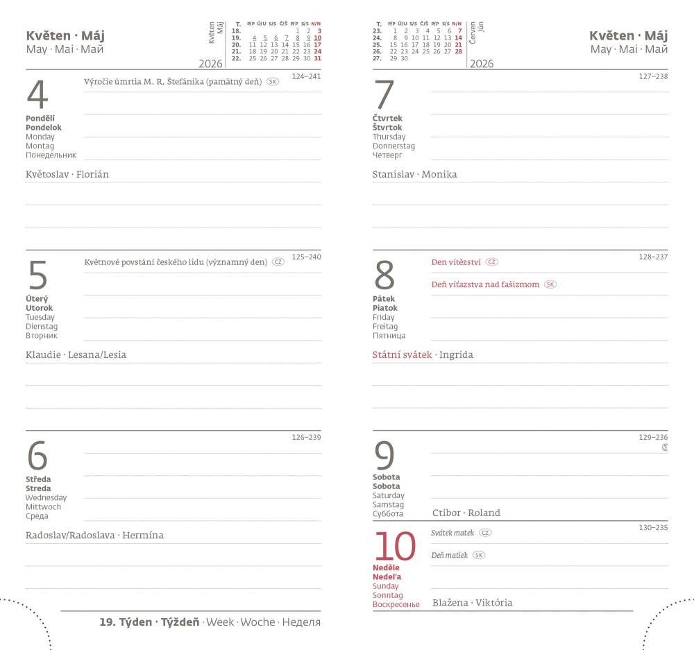 Dosky diára sú vyrobené z univerzálneho matného materiálu na báze zušľachteného papiera, ktorý je bez štruktúry, čím neruší vzhľad samotného produktu. Odporúčame tampónovú tlač. Diár obsahuje: osobné údaje, plánovač dovolenky (mesačný prehľad), plánovací kalendár, medzinárodné sviatky, ročný výhľad, týždenný layout, adresár Formát diára: 80 x 150 mm Rozsah diára: 128 strán Kalendárium: týždenné vreckové