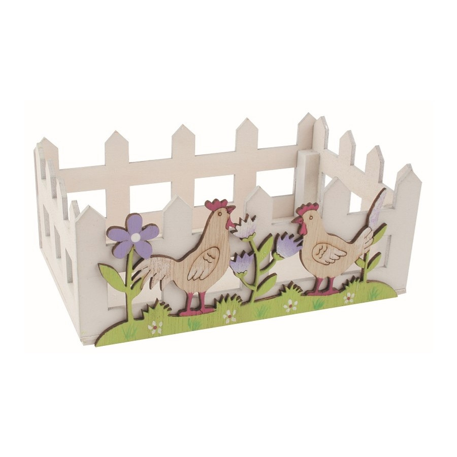 Roztomilá drevená ohrádka so slepicou v bielom prevedení je štýlová dekorácia, ktorá vniesie jarnú atmosféru a radosť do vášho domova počas Veľkej noci aj celého jarného obdobia. Dekoráciu jednoducho postavíte na stôl, parapet alebo poličku ako samostatný dekoratívny prvok, alebo ju využijete ako originálny podklad pre aranžmány s ďalšími dekoráciami, zápichmi, veľkonočnými vajíčkami či jarnou výzdobou. Ohrádka so slepicou prináša hravý detail, ktorý podčiarkne tematickú výzdobu a vytvorí útulné prostredie.