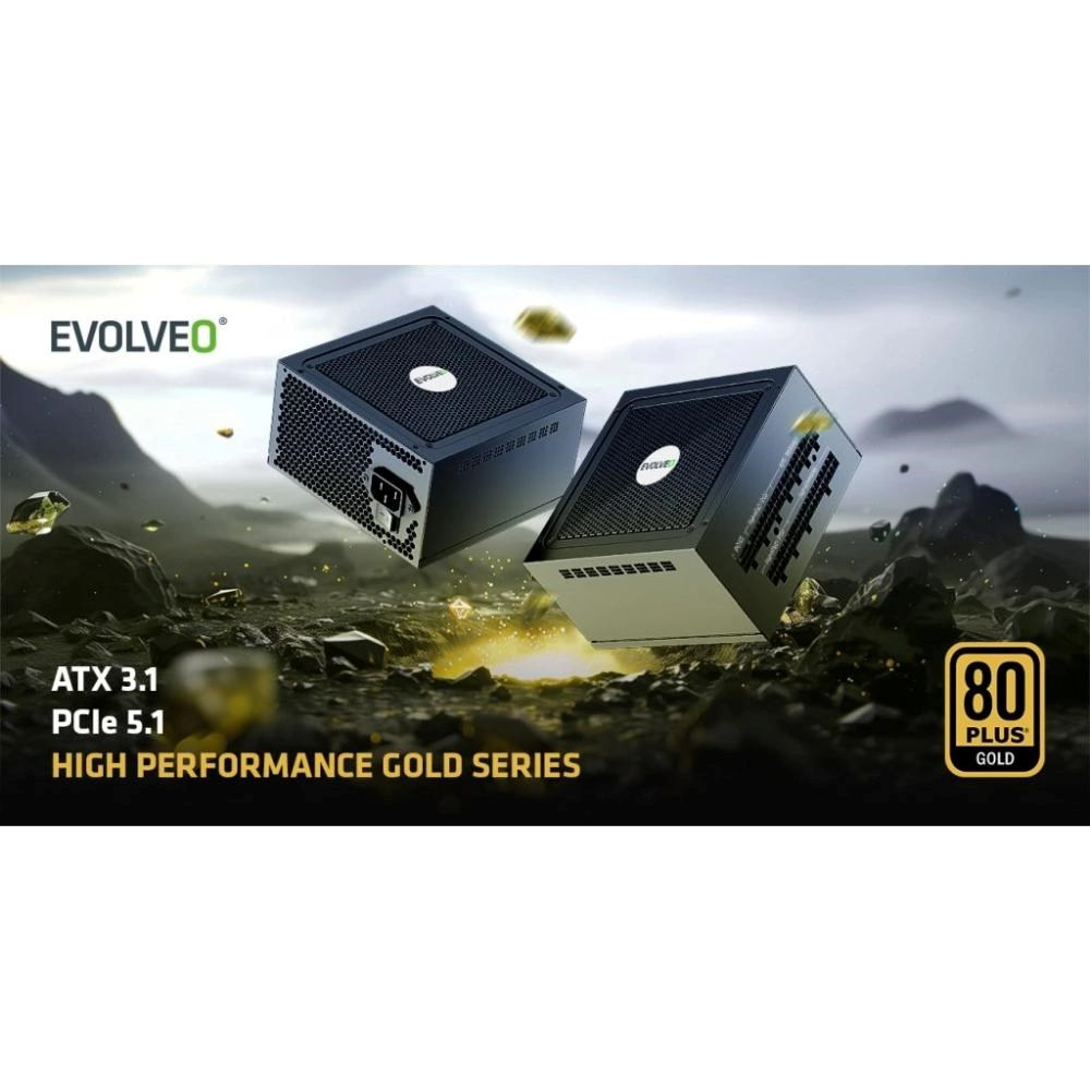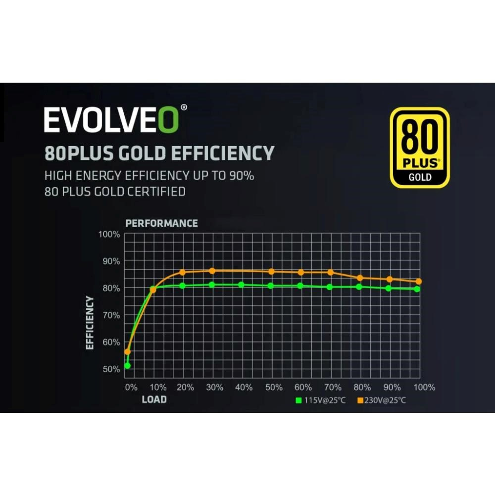 PC zdroj EVOLVEO G850-BK je hrdým držiteľom certifikácie 80 PLUS Gold, ktorá sľubuje až 92% účinnosť (pri bežnom 50% zaťažení). Minimálne straty energie a nízke zahrievanie idú ruka v ruke s tichým chodom 140mm HDB ventilátora – ten má medzi hriadeľom a ložiskami špeciálnu olejovú vrstvu a jeho trenie je nepatrné, takže hlučnosť zostáva na minime. S týmto zdrojom vás jednoducho neruší hučanie ventilátora – počuť je len šušťanie kolies vašej formule alebo rimovanie zbraní vašej armády.