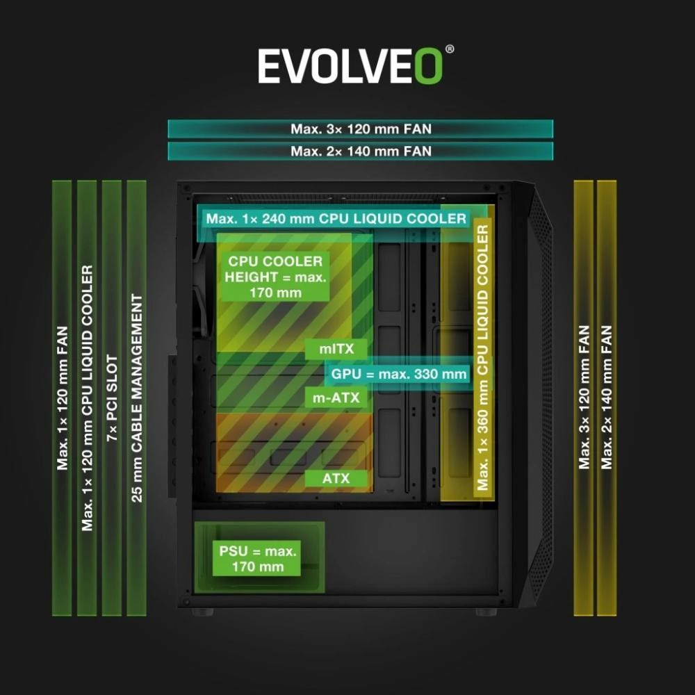 EVOLVEO Xenon-BK-4 je zkrátka počítačová skříň pro hráče, kteří si nehodlají dělat zbytečné starosti a chtějí hrát stylově, efektivně a bez kompromisů. Ubytujte v ní svůj hardwarový all-star tým a připravte se na herní zážitky, které budou stát za to.