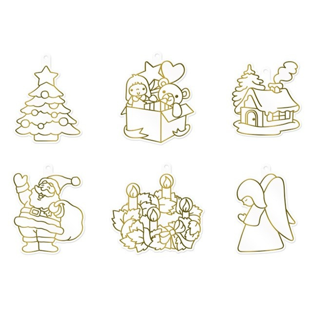 Vyfarbite a ozdobte 6 závesných sklíčok s krásnymi vianočnými motívmi, ako sú stromček, darčeky, anjel alebo Santa.