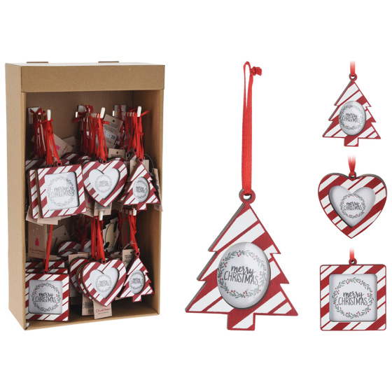 Vianočný fotorámik na zavesenie s bielo-červenými pruhmi.