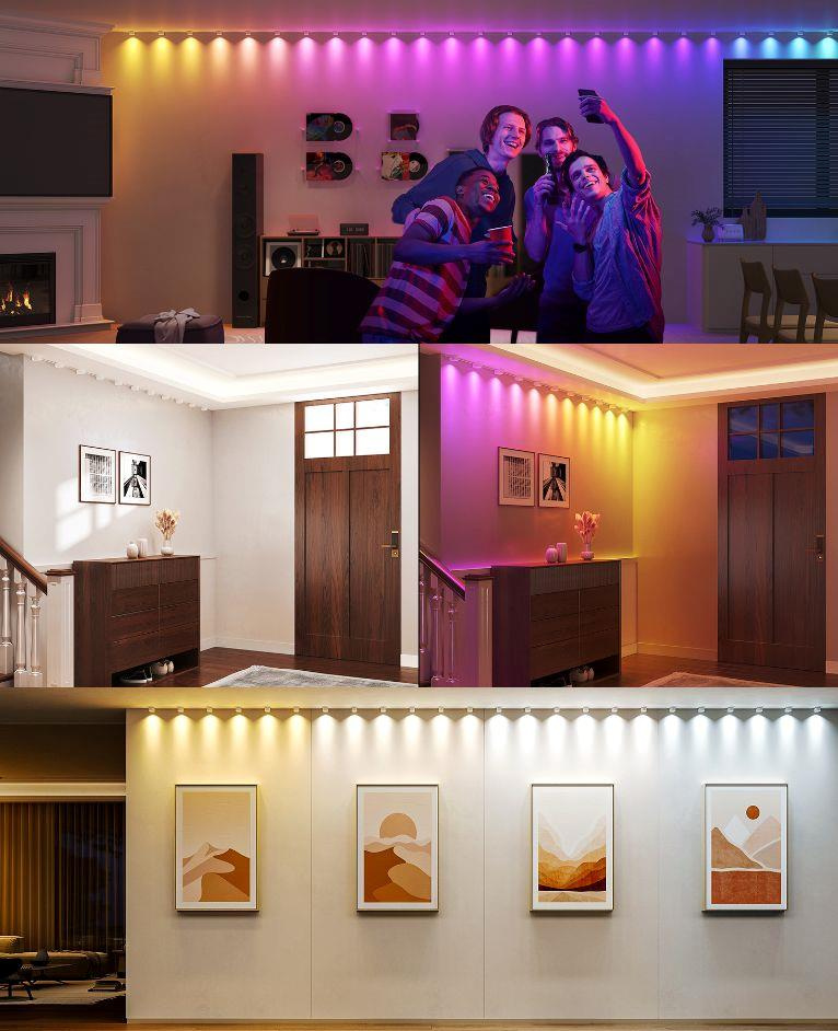 Stropné svetlá Govee String Downlights vo vašom domove vytvoria dokonalú atmosféru. Reťazec 25 nezávisle programovateľných LED svetiel, rozložených na dĺžku 5 metrov, vytvára z nudnej steny umelecké dielo veľkoplošnej RGB projekcie. Vďaka technológii RGBIC je možné každý reflektor ovládať nezávisle, vyberať RGB odtieň, teplotu bielej farby a jas. String downlight je plne ovládateľný pomocou aplikácie Govee, funguje s asistentmi Google alebo Alexou a samozrejmosťou je aj vzdialené ovládanie alebo pohodlný časovač. Reťaz stropných svetiel Govee dokáže vizualizovať hudbu, disponuje 64 presetmi vrátane sezónnych a sviatočných a ponúka mocný DIY režim, v ktorom nie je nič nemožné. Inštalácia reťaze je jednoduchá a v balení nájdete všetko potrebné. Svetlá je možné viesť aj po oblých stenách a nie je problém umiestniť aj cez roh miestnosti. Pre vzhľadné umiestnenie je možné reťaz aj ľubovoľne zkrátiť.