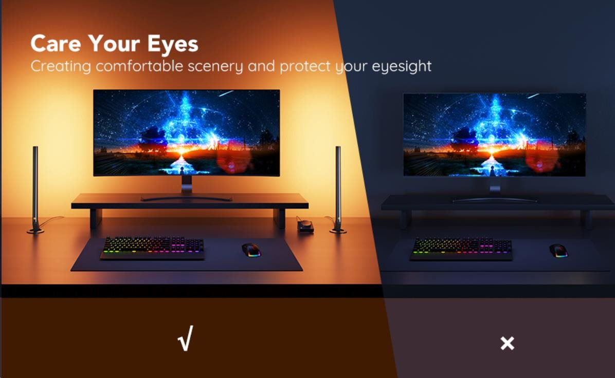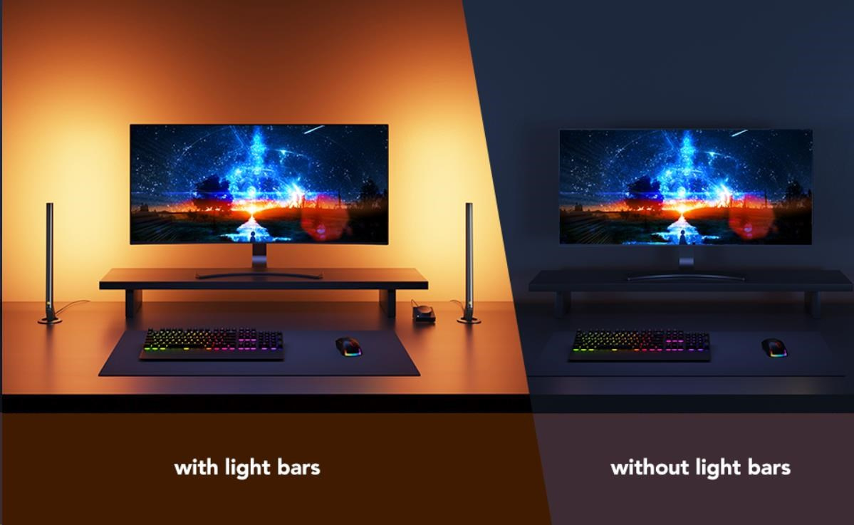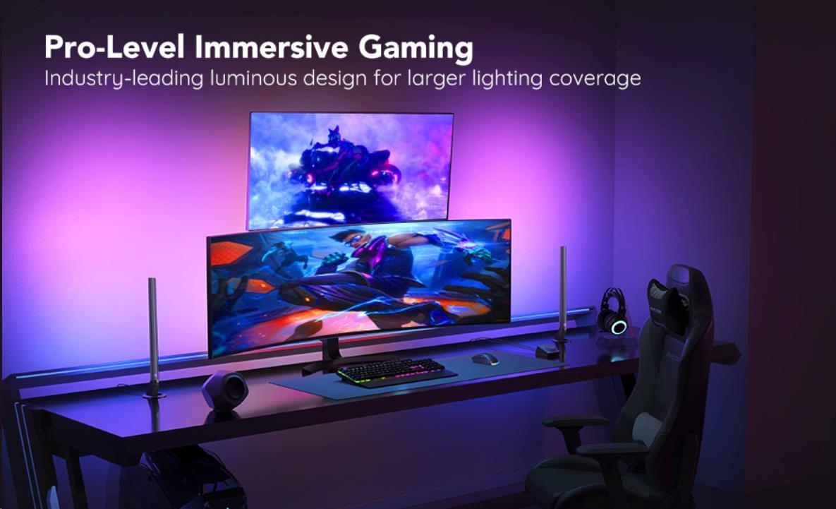 Zlepšite svoje herné, filmové a hudobné zážitky s chytrými svetelnými panelmi Govee Smart Gaming. 16 miliónov farieb s 62 režimami a 8 režimami pre synchronizáciu s hudbou pozdvihnú zážitok zo sledovania televízie alebo hrania hier na novú úroveň. Ovládajú sa hlasom cez Siri, Amazon Alexa alebo Google Assistant, cez aplikáciu alebo cez Smart Dual ovládač. Preto ani nebudete musieť vstať z gauča. Farebné podsvietenie opticky zväčšuje obraz, šetrí oči a má životnosť až 50 000 hodín.