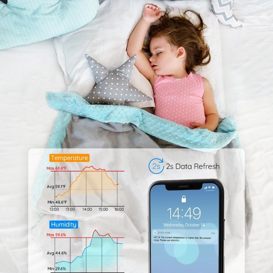 Wi-Fi teplomer a vlhkomer Govee vám umožňuje presne monitorovať teplotu a vlhkosť vo vašej domácnosti, teráriách, inkubátoroch, vínnych pivniciach alebo spálňach, čím pomáha vytvárať zdravé a stabilné prostredie. Vďaka vysoce presnému senzoru získate spoľahlivé údaje v reálnom čase, ktoré sú nevyhnutné pre komfort a ochranu citlivých oblastí. Kompaktný a prenosný dizajn umožňuje jednoduché umiestnenie kdekoľvek bez obmedzení. Zariadenie je ideálne ako na každodenné použitie, tak aj na špecializované aplikácie vyžadujúce presnosť.