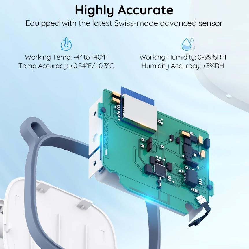 Vysoko presný senzor zabezpečuje spoľahlivé a konzistentné merania teploty a vlhkosti v reálnom čase, takže máte vždy k dispozícii skutočne presné údaje. Vďaka pokročilej senzorovej technológii Govee sú okamžite detegované aj malé zmeny v prostredí, čo je ideálne pre citlivé oblasti, ako sú teráriá, inkubátory, vínne pivnice alebo spálne. Presné údaje sú základom pre správne rozhodnutia, väčší komfort a zdravšie prostredie každý deň. Senzor pracuje v rozsahu -20 až 60 °C, vlhkosť 0-99 % a má presnosť 0,3 °C a 3 % RH.