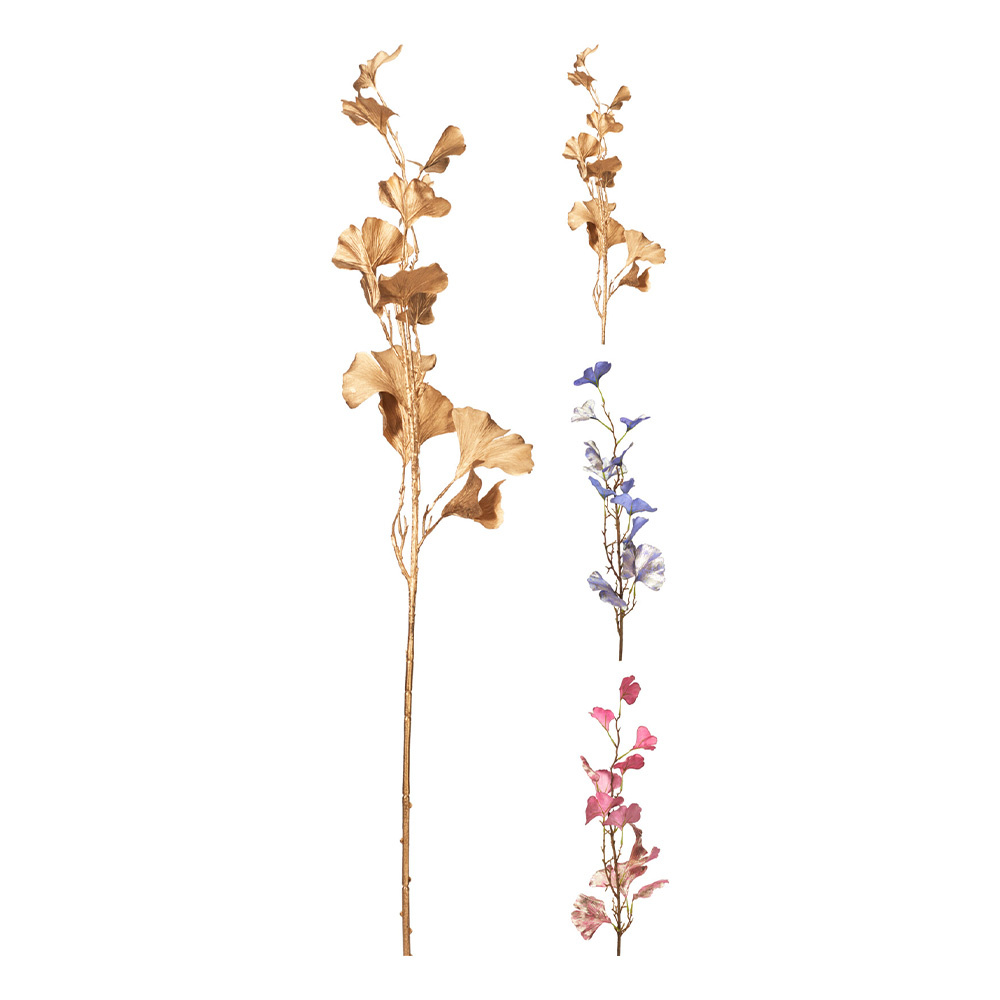 Umelá dekorácia vhodná do väčšej vázy alebo na kreatívne dotvorenie Vášho diela. Vetvička s listami Gingka /16 lístkov z kovu v troch sviežich farbách.