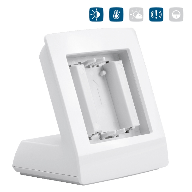 Pod krytom v spodnej časti zariadenia sa nachádza zásobník pre dva kusy tužkových napájacích batérií 1,5 V typu AA a stojínek tak môže veľmi dobre fungovať aj ako dokovacia napájacia stanica pre vložené zariadenia bez napájacích batérií. Ak je do Stojánku (HmIP-DS55) s batériami integrovaný bezdrôtový batériový prvok, bude predĺžená pracovná doba tejto komponenty vďaka použitiu batérií typu AA namiesto bežne používaných batérií typu AAA priamo v zariadení.