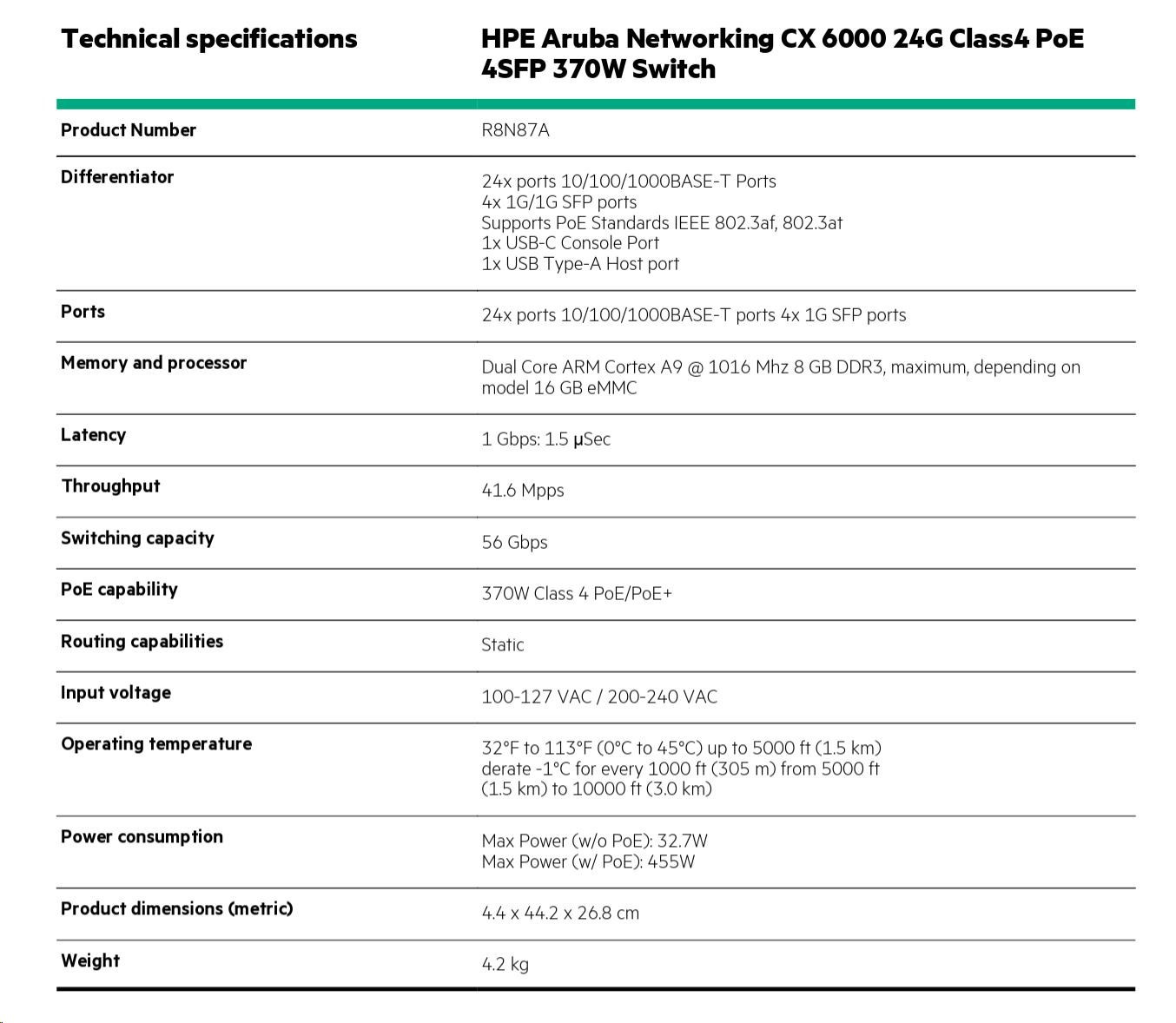 HPE Aruba Networking CX 6000 24p 10M/100M/1G Class4 PoE 4p SFP 1G 370W Switch R8N87B