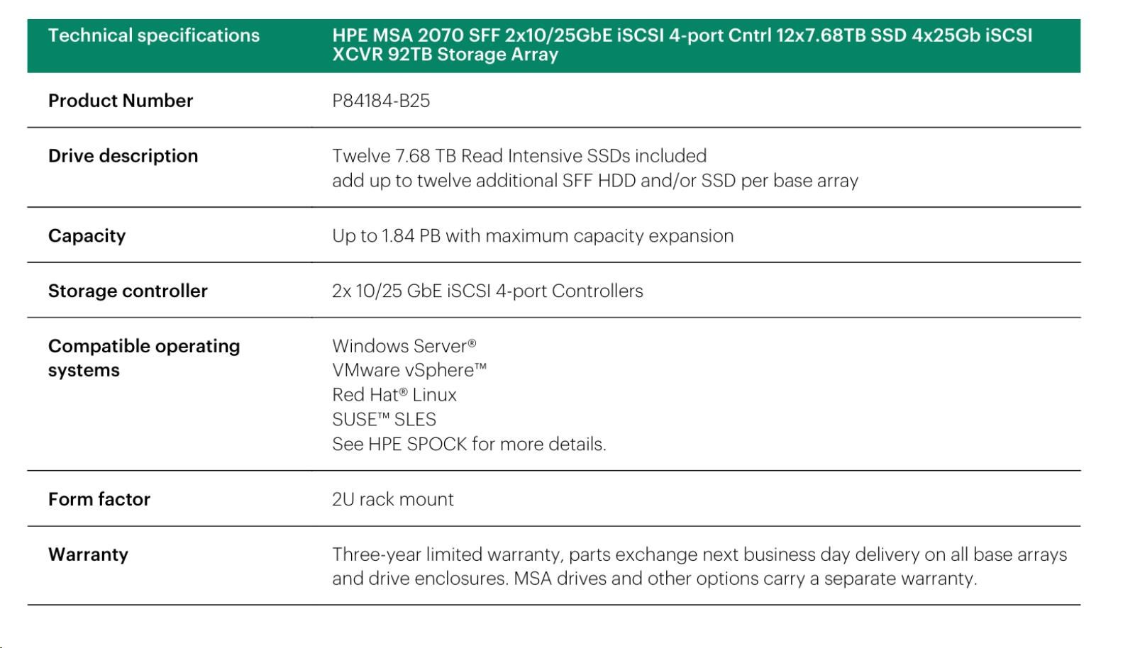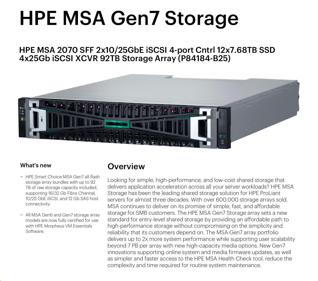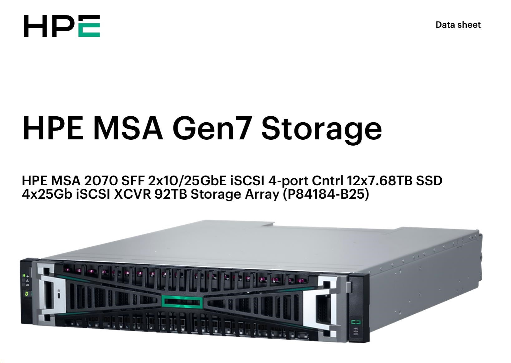 HPE MSA 2070 SFF 2x10/25GbE iSCSI 4-port Controller 12x7.68TB SSD 4x25Gb iSCSI XCVR 92TB Storage Array Smart Choice
