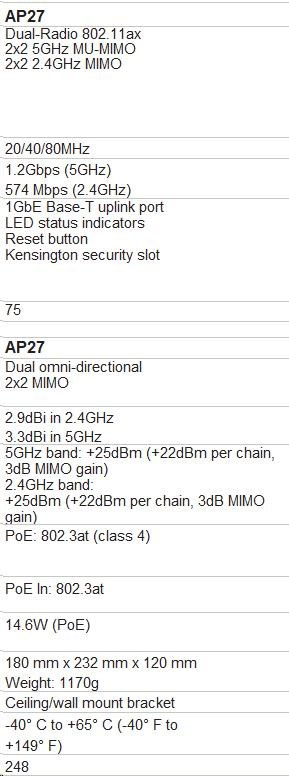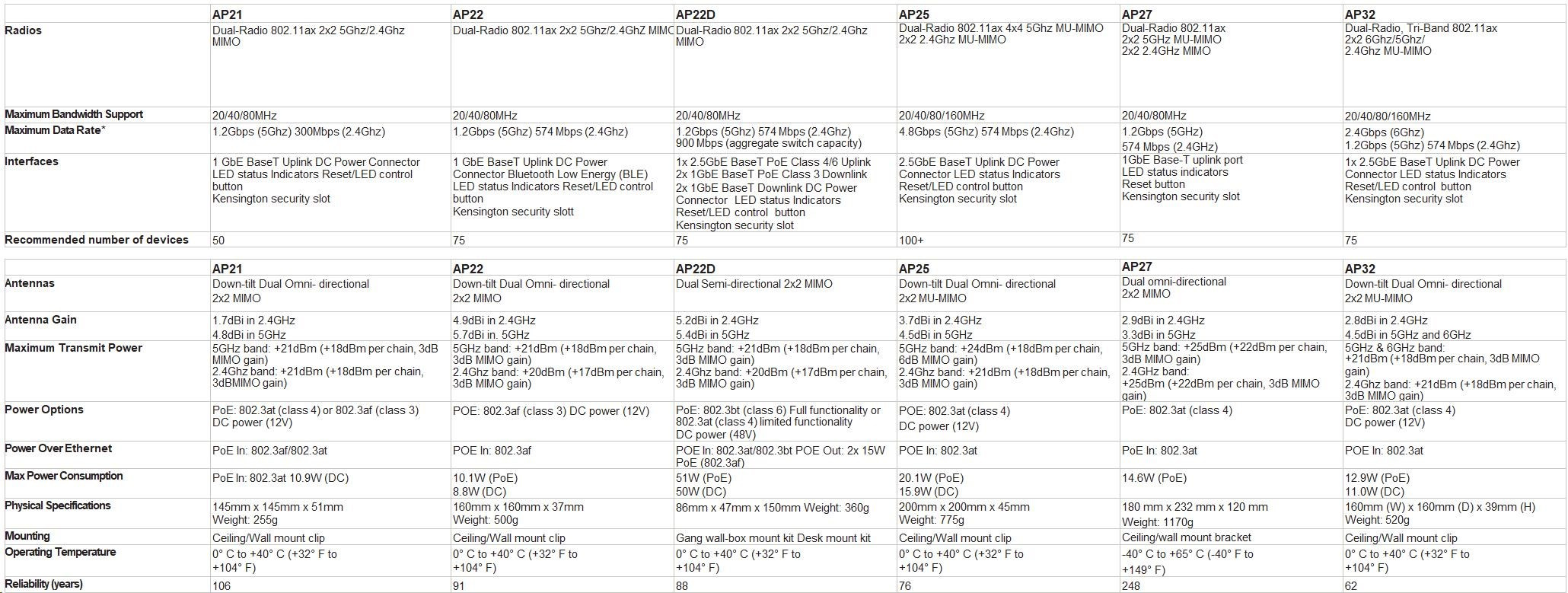 | Interfaces | 1 GbE BaseT Uplink DC Power Connector LED status Indicators Reset/LED control button Kensington security slot | 1 GbE BaseT Uplink DC Power Connector Bluetooth Low Energy (BLE) LED status Indicators Reset/LED control button Kensington security slott | 1x 2.5GbE BaseT PoE Class 4/6 Uplink 2x 1GbE BaseT PoE Class 3 Downlink 2x 1GbE BaseT Downlink DC Power Connector LED status Indicators Reset/LED control button Kensington security slot | 2.5GbE BaseT Uplink DC Power Connector LED status Indicators Reset/LED control button Kensington security slot | 1GbE Base-T uplink port LED status indicators Reset button Kensington security slot | 1x 2.5GbE BaseT Uplink DC Power Connector LED status Indicators Reset/LED control button Kensington security slot |