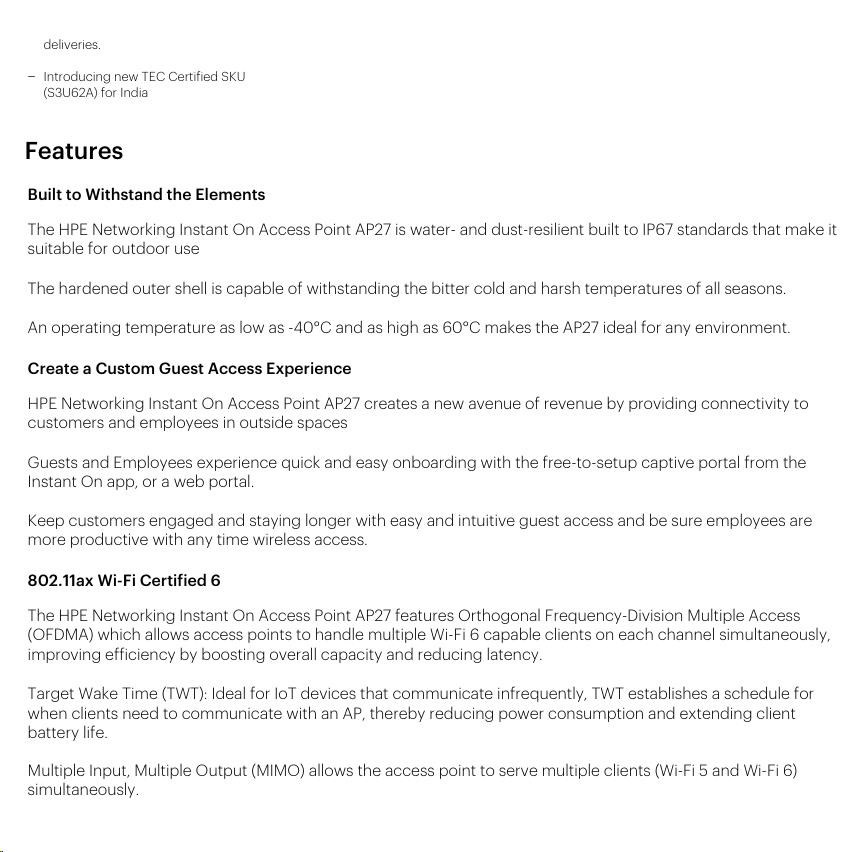 Take your business outdoors with the HPE Networking Instant On Access Points AP27. This fast outdoor Wi-Fi 6 AP is IP67 rated, keeping you connected through hot summers, frigid winters, rain, sleet, and snow. Able to withstand temperatures from temperatures from -40°F to 149°F, you can confidently connect up to 75 devices over Wi-Fi 6 to extend coverage to parking lots, outdoor workspaces, and hotel pools.