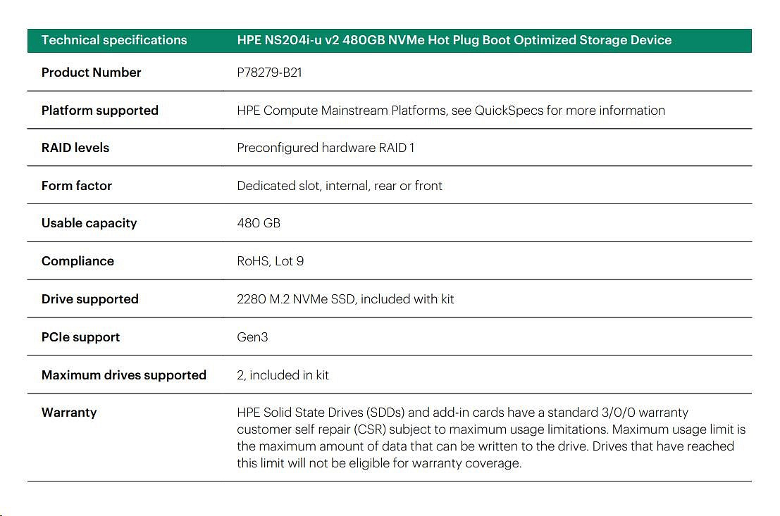 HPE NS204i-u v2 480GB NVMe Hot Plug Boot Optimized Storage Device P78279-B21 RENEW.