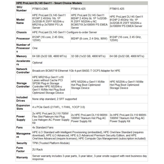 HPE PL DL145g11 AMD 8024P (2.4/8C) 1x32G 2SFF NS204i-u 2x1000W 4x1Gb Smart Choice