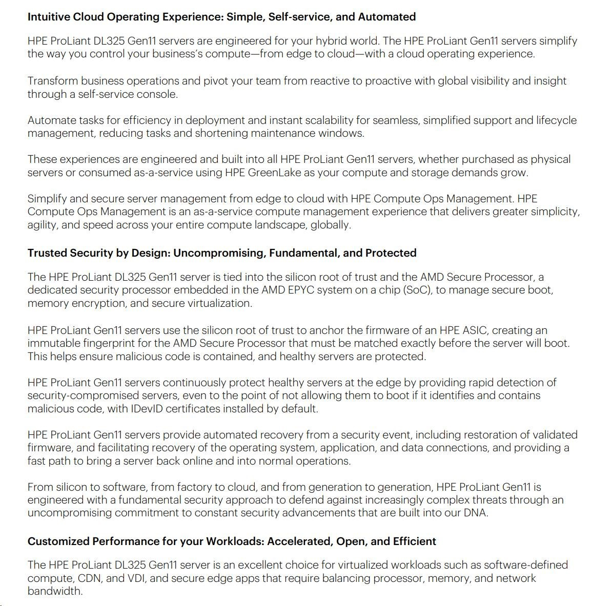 | Management | Default: HPE iLO Standard with Intelligent Provisioning, HPE OneView Standard (requires download) |