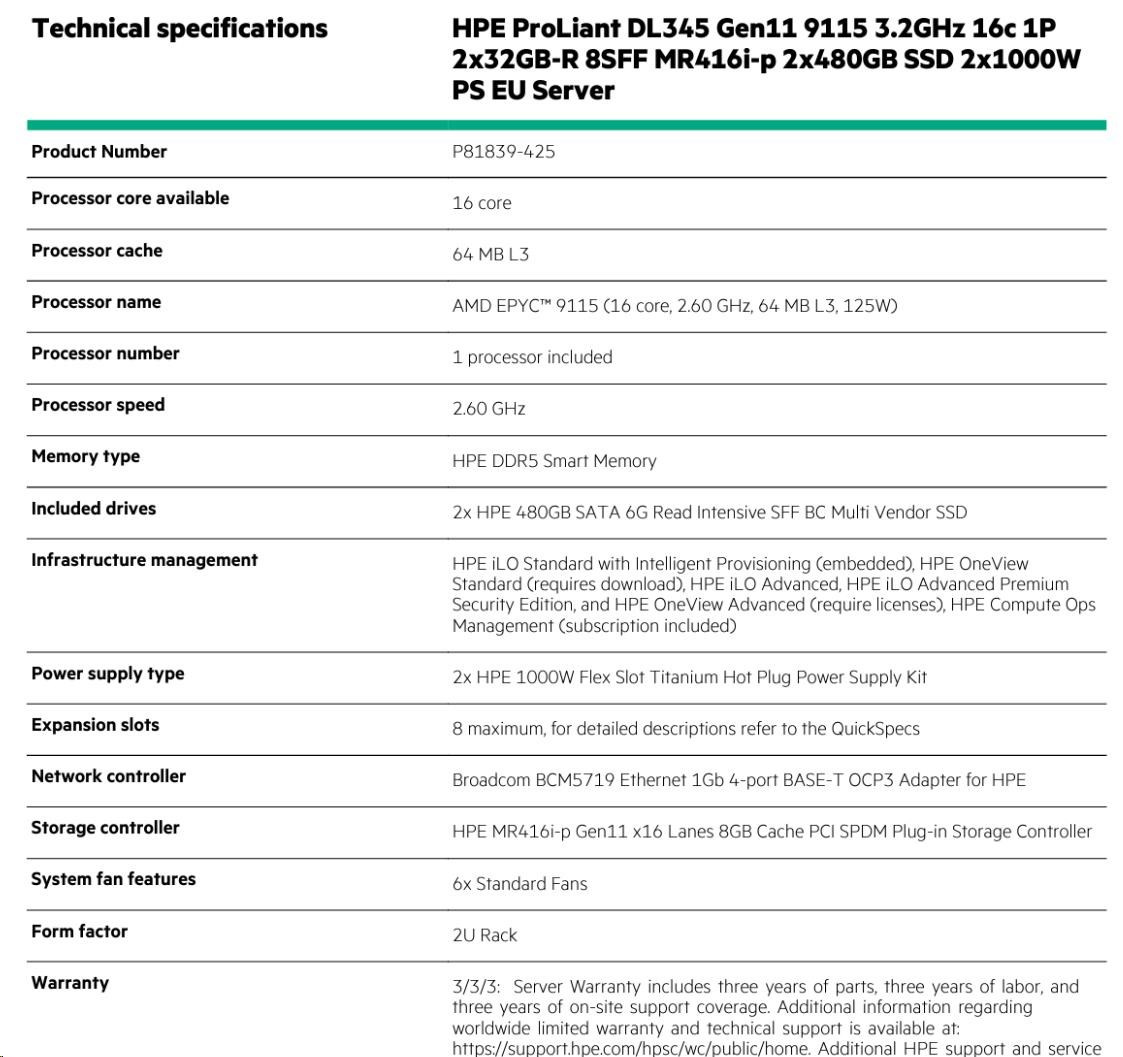 Warranty 3/3/3: Server Warranty includes three years of parts, three years of labor, and three years of on-site support coverage. Additional information regarding worldwide limited warranty and technical support is available at: https://support.hpe.com/hpsc/wc/public/home. Additional HPE support and service coverage for your product can be purchased locally. For information on availability of service upgrades and the cost for these service upgrades, refer to the HPE website at https://www.hpe.com/support.