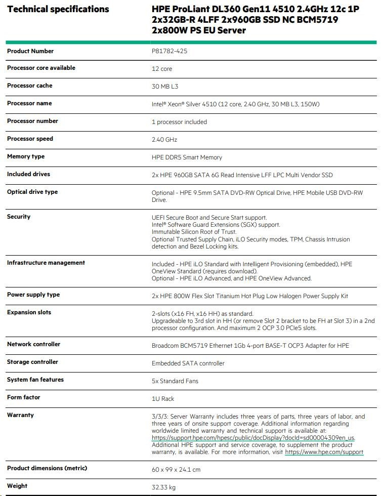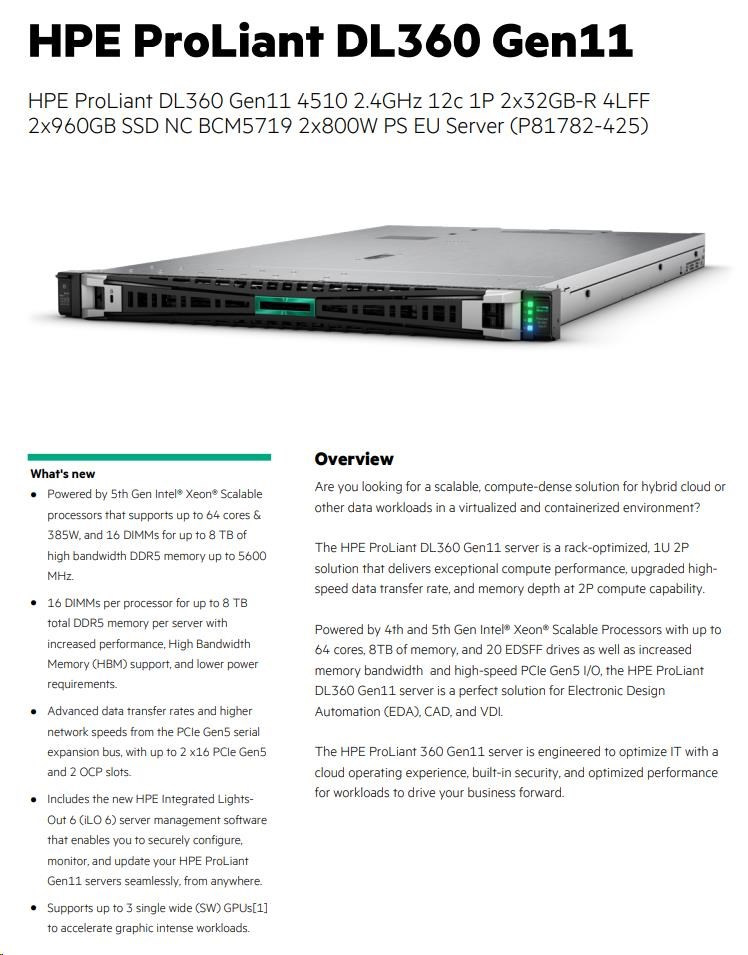 HPE PL DL360g11 4510 (2.4G/12C) 2x32G 2x960G VROC 4LFF LPC 2x800W 4x1G Smart Choice