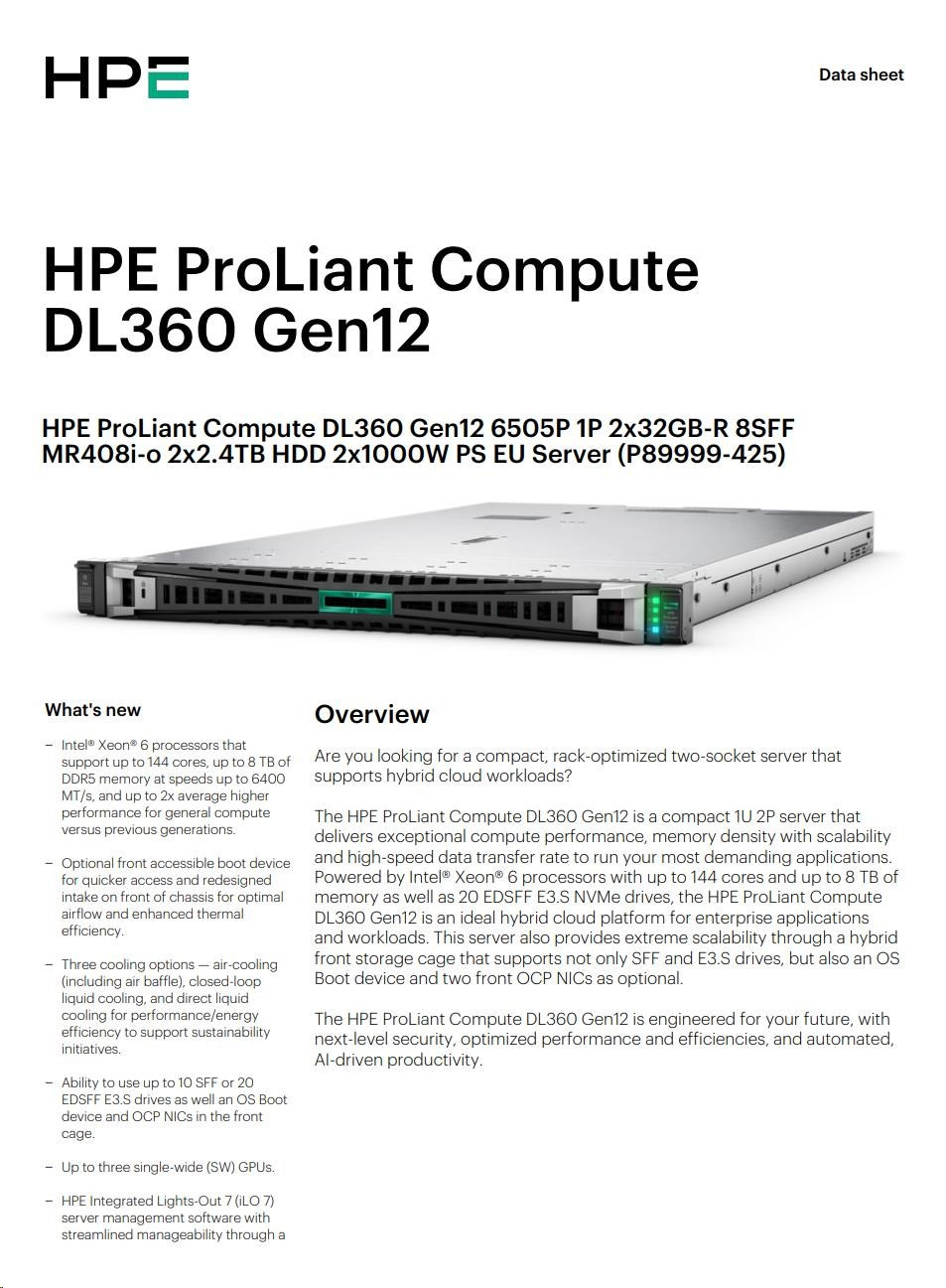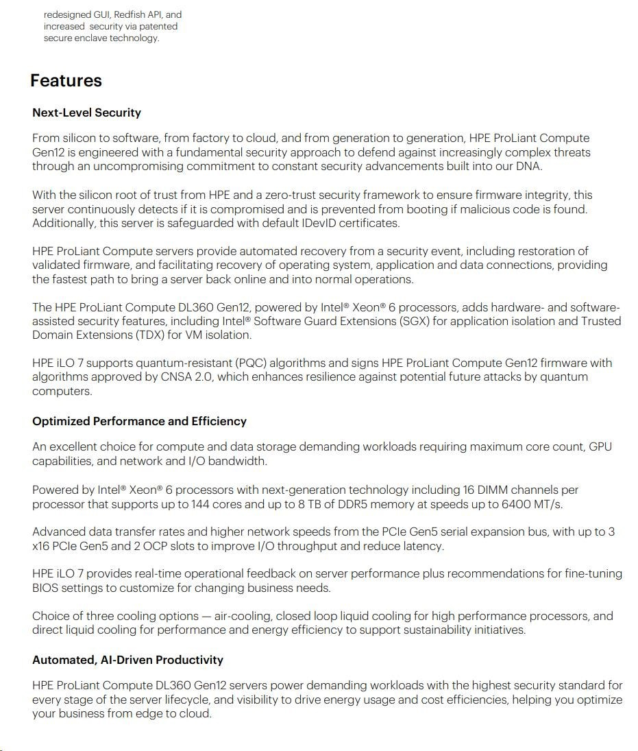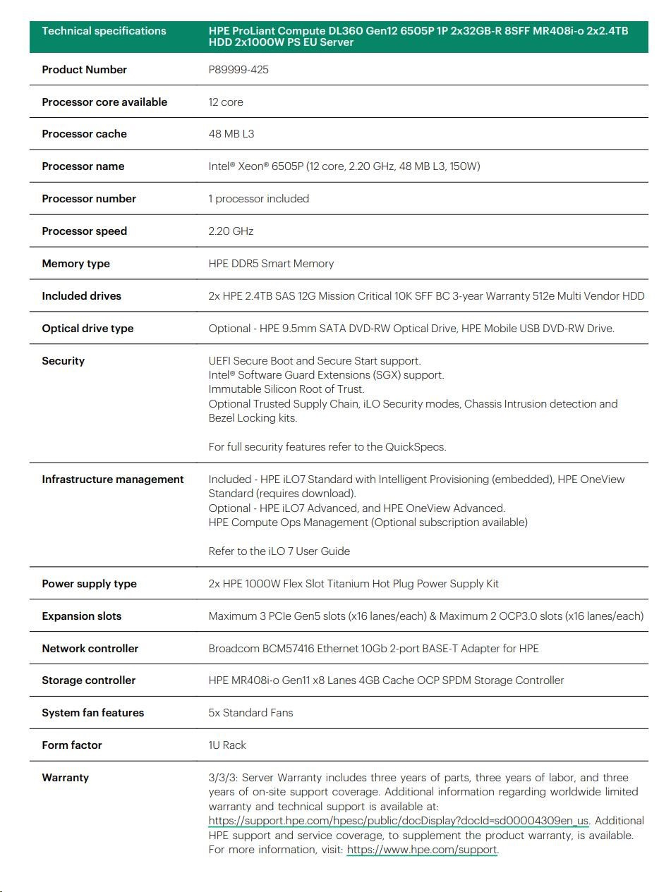HPE PL DL360g12 6505P (2.2G/12C) 2x32G (P69727) 2x2.4TB MR408i-o 8SFF 2x1000W 2p10GbE NBD333 Smart Choice
